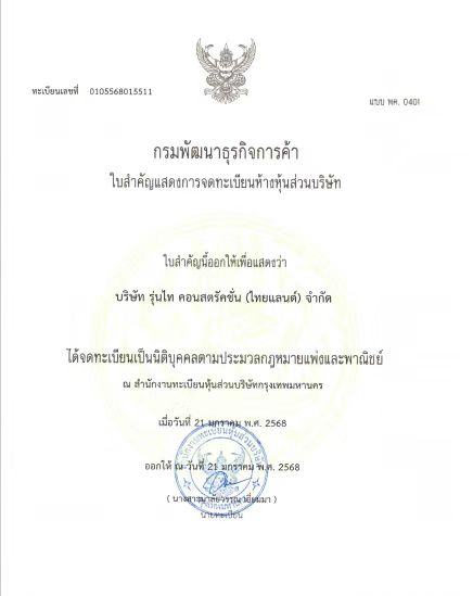 2025年,公司在國(guó)際化進(jìn)程中又一次邁出了重要一步,潤(rùn)泰建築(泰國(guó))有限公司在泰國(guó)正式成立,位於羅勇府-尼空帕塔納縣-尼空帕塔納鎮(zhèn)-第 3 號(hào)村-999/7。泰國(guó)公司的設(shè)立將進(jìn)一步提升我們的國(guó)際化服務(wù)能力,深化在地化營(yíng)運(yùn)。我們將依賴豐富的全球?qū)0附?jīng)驗(yàn)與技術(shù)優(yōu)勢(shì),為泰國(guó)及週邊市場(chǎng)提供高品質(zhì)的建築解決方案。