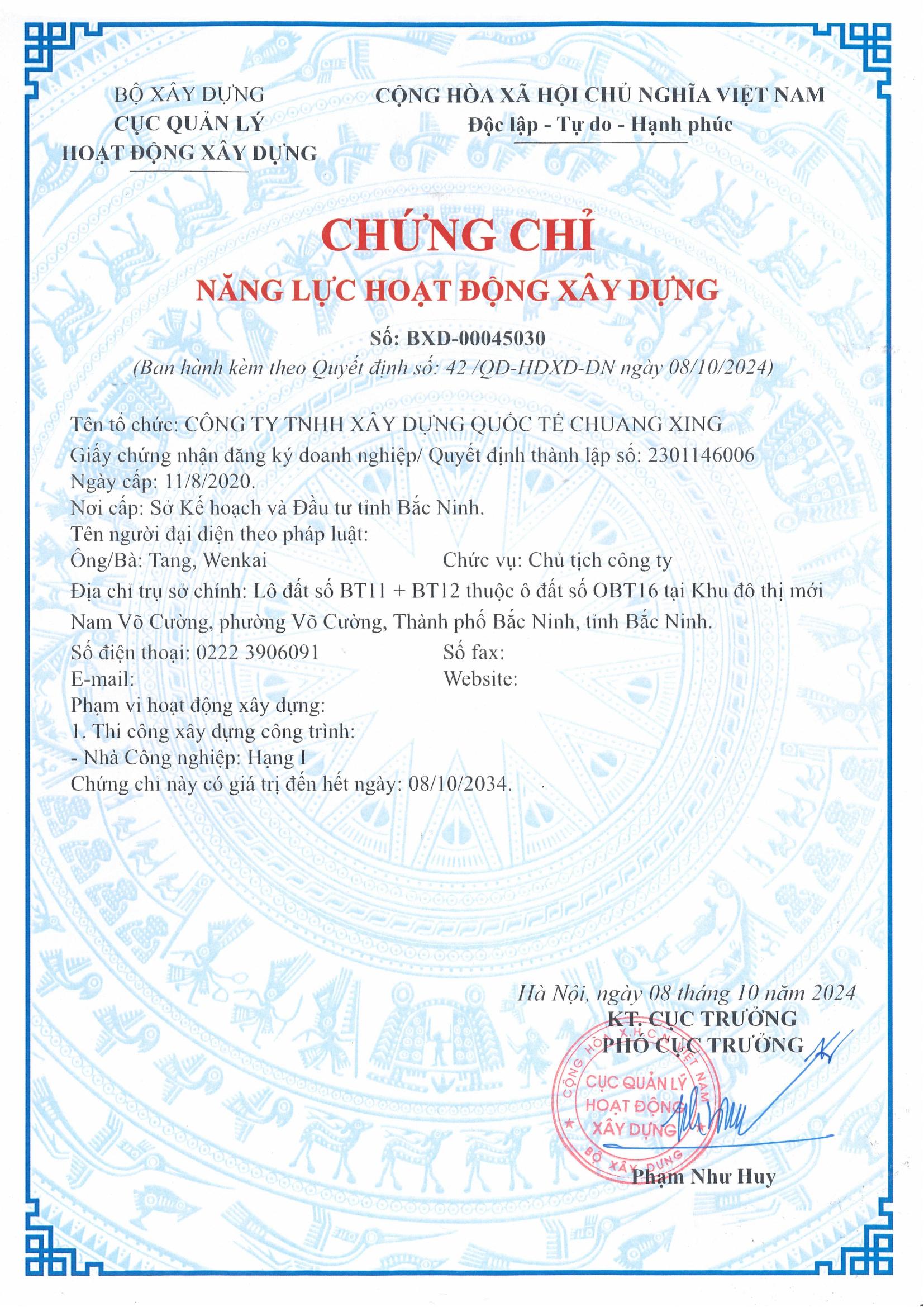 C?ng ty C? ph?n Xay d?ng Chuang Xing Tham Quy?n ???c thành l?p n?m 2010 v?i s? v?n ?i?u l? là 80 tri?u nhan dan t?, có tr? s? chính t?i qu?n B?o An thành ph? Tham Quy?n và có các chi nhánh t?i ??ng Qu?n, Hu? Chau, Vi?t Nam, Mexico…, Chuang Xing là m?t doanh nghi?p c?ng ngh? cao qu?c gia, chuyên xay d?ng nhà x??ng c?ng nghi?p.Ph?m vi kinh doanh c?a C?ng ty bao g?m: C?ng trình xay d?ng, c?ng trình c? ?i?n, k?t c?u thép, c?ng trình l?c, c?ng trình ?i?n t? và th?ng minh, c?ng trình trang trí, s?a ch?a và b?o trì, thi?t k? và thi c?ng vách ng?n c?nh quan, v.v., cung c?p cho khách hàng các d?ch v? qu?n ly và tr?n gói trong su?t quá trình t? thi?t k?, xay d?ng, l?p ??t, trang trí ??n v?n hành, b?o trì b?o d??ng và c?p nh?t thi?t b? hàng ngày.